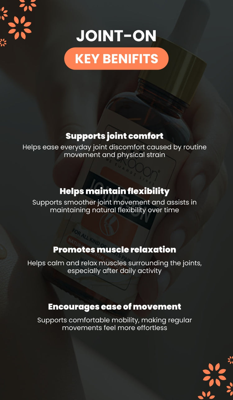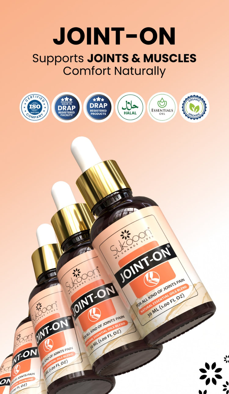 Joint On Oil blend for joints pain, your natural solution to reducing joints pain and knee pain, stiffness and swelling. This blend is made with potent natural essential oils that target joints pain symptoms naturally, which include back pain, knee pain, neck pain, arthritis pain, tennis elbow, muscle strain and sprains. Joint On Oil covers you, whether you are an athlete or simply seeking relief from daily discomfort.